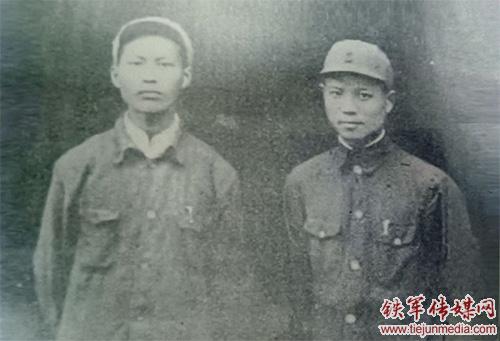 1944年,新四军一师、苏中军区党委副书记陈丕显(右)与时年33岁的邹正帮(左、邹迎柯之父)在草庙时的合影。